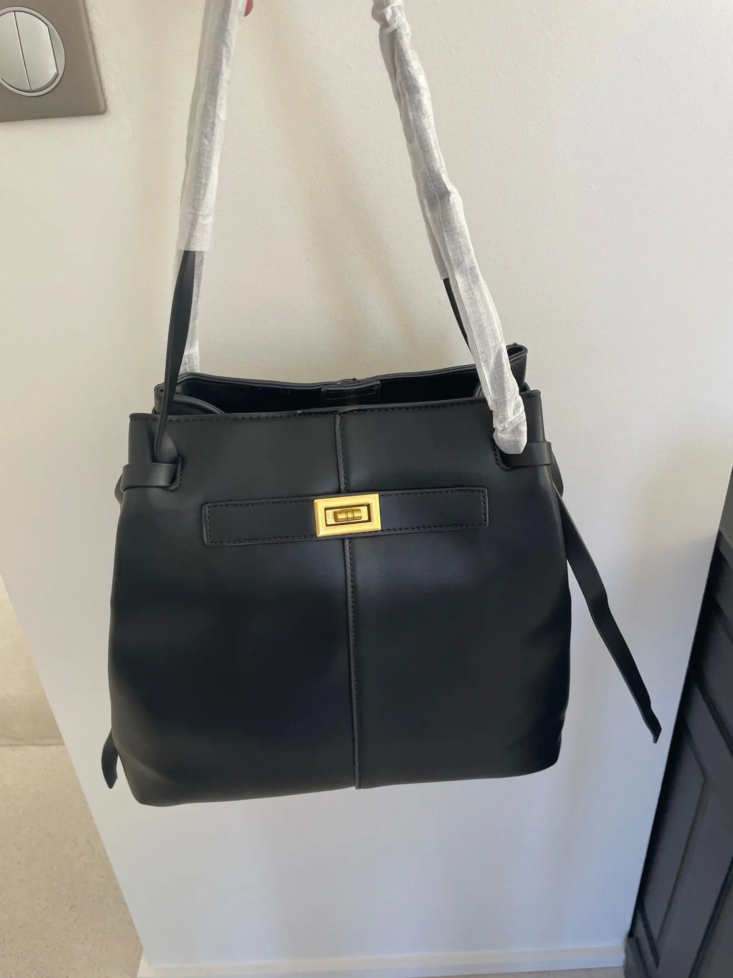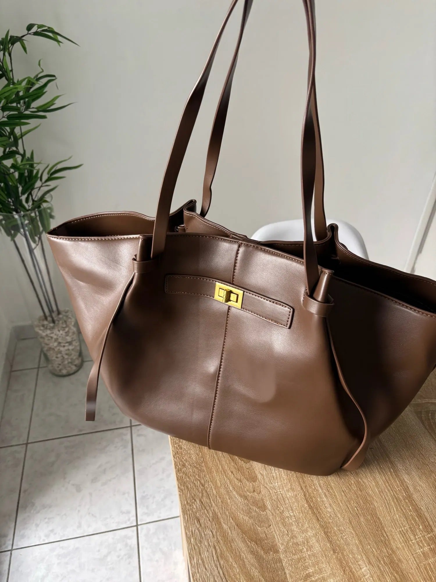 Borsa shopper a trapezio dal profilo moderno e lineare, impreziosita dalla chiusura a girello in metallo dorato. I lunghi manici garantiscono comfort e praticità, mentre i nastri laterali aggiungono un dettaglio distintivo al design.