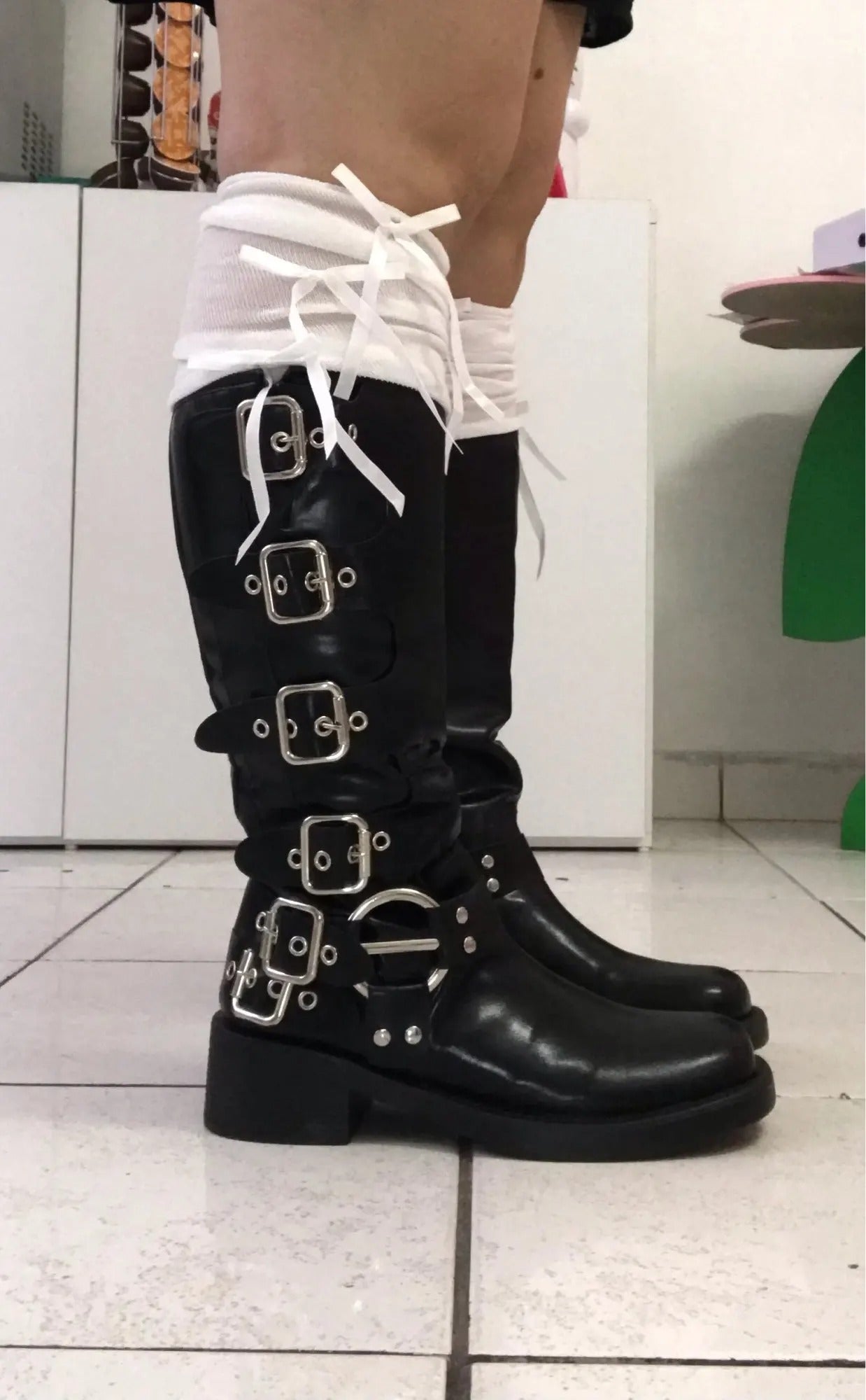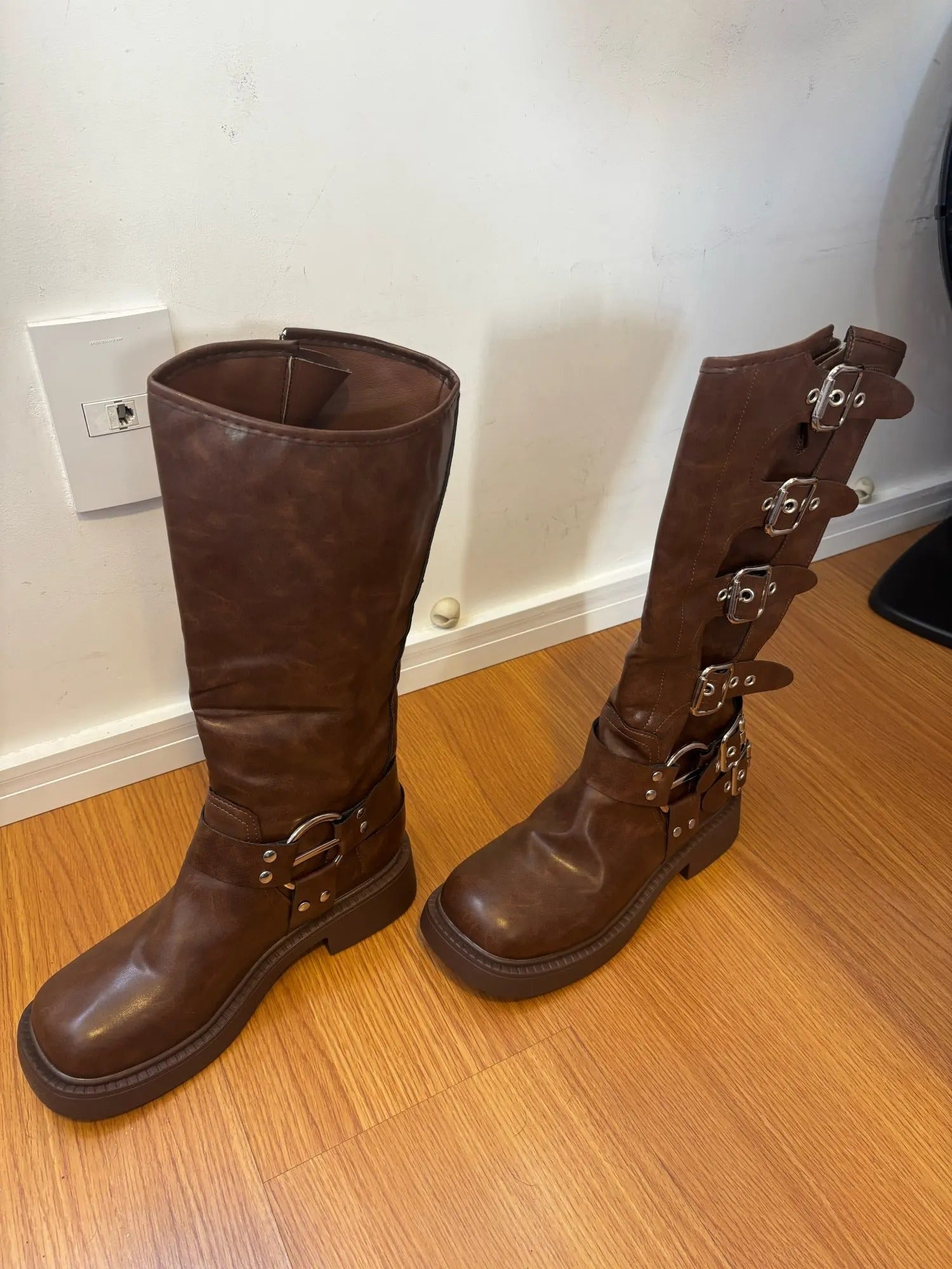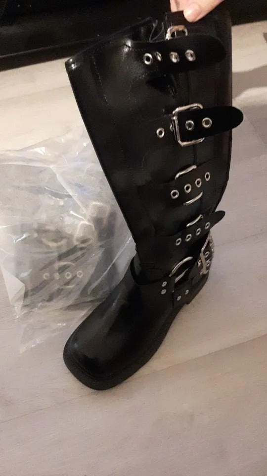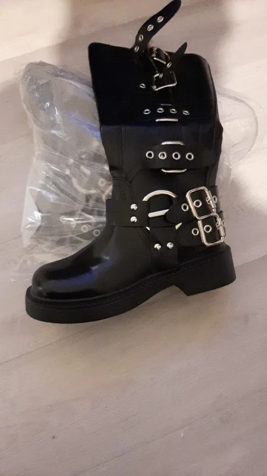 Questi stivali alti con fibbie metalliche portano subito carattere a ogni look. Non passano inosservati e aggiungono un tocco ribelle e grintoso anche agli outfit più semplici. Indossarli significa dare personalità a ogni passo.